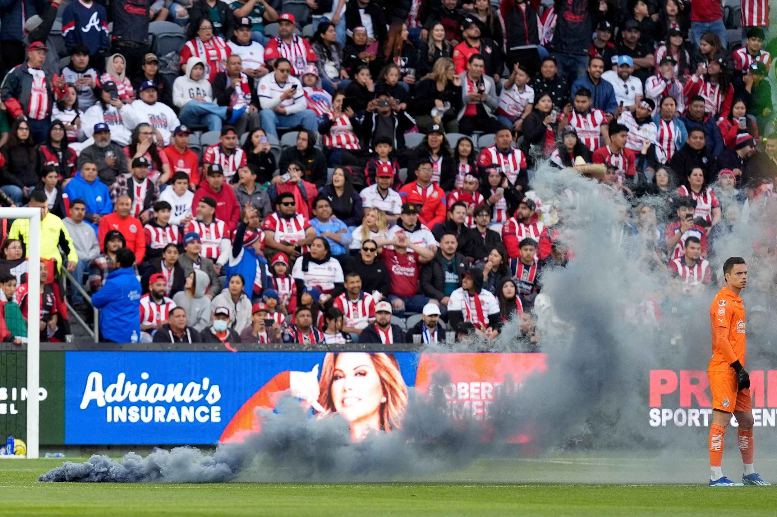 Óscar Whalley stands unfazed as smoke drifts across the pitch, with Chivas supporters packed in the stands behind him at BMO Stadium.