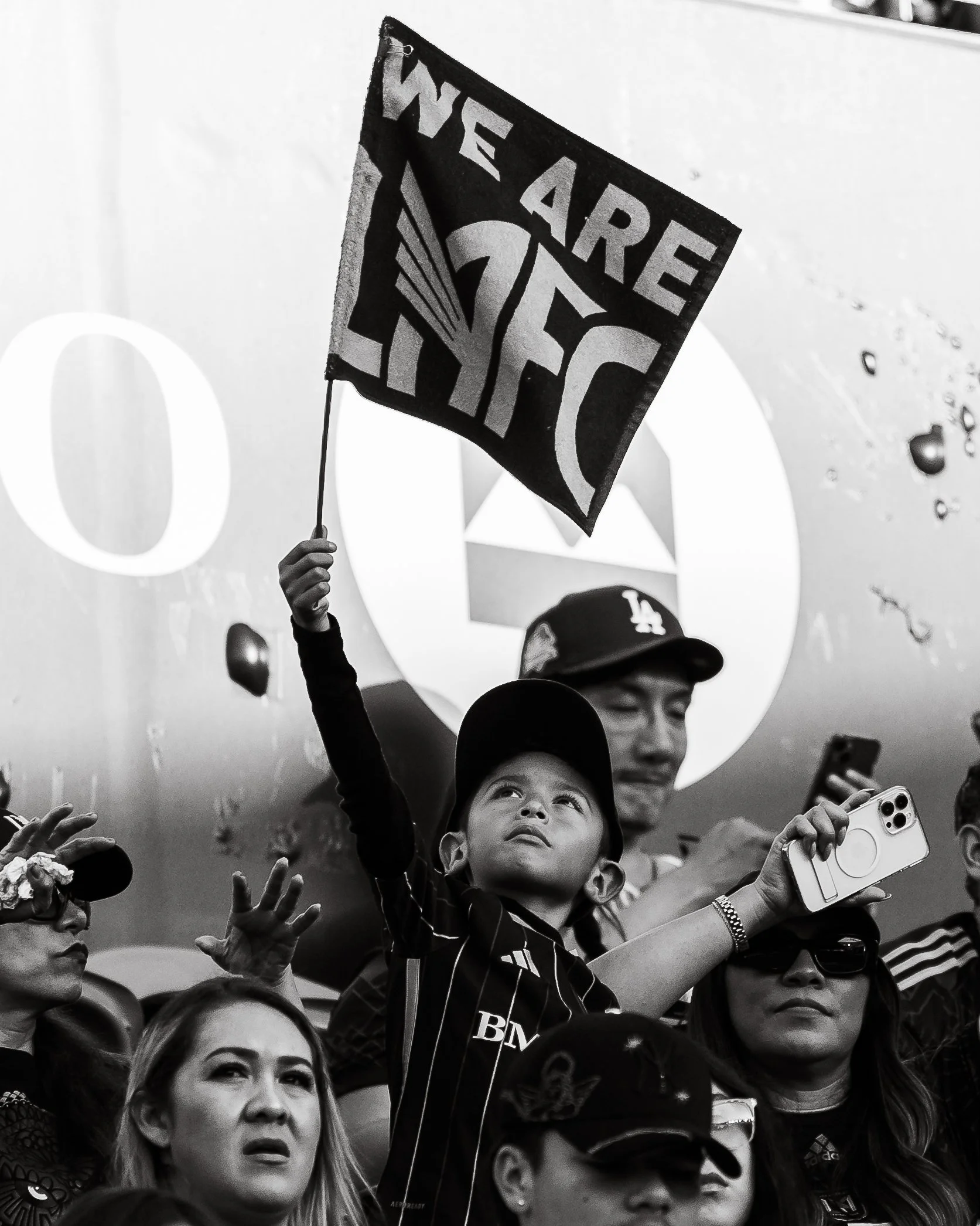 An LAFC supporter raises their flag high, proudly representing and showing love for the Black & Gold.