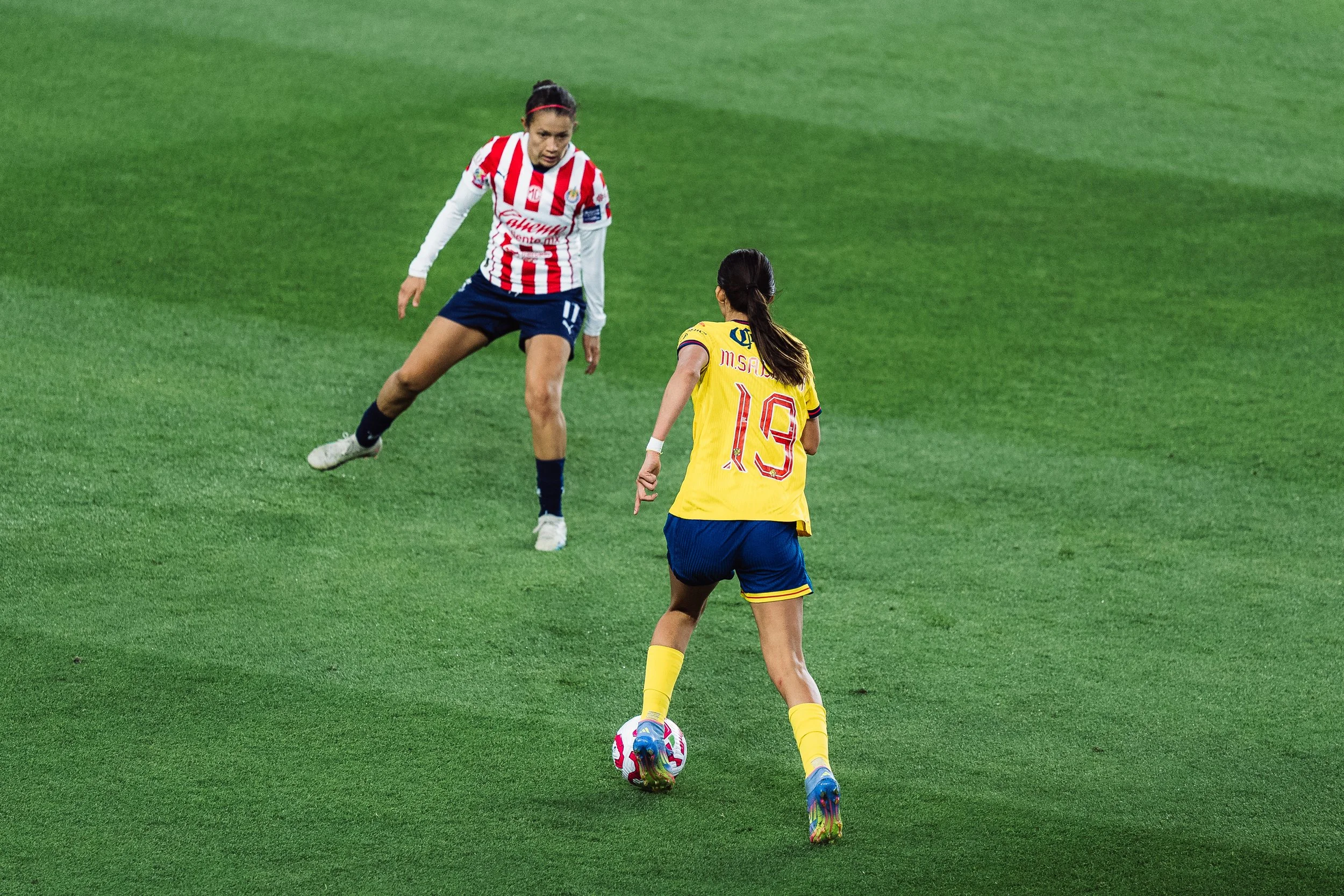 Montserrat Saldivar faces off against a Chivas defender during the Clásico Femenil at BMO Stadium on May 17, 2025.